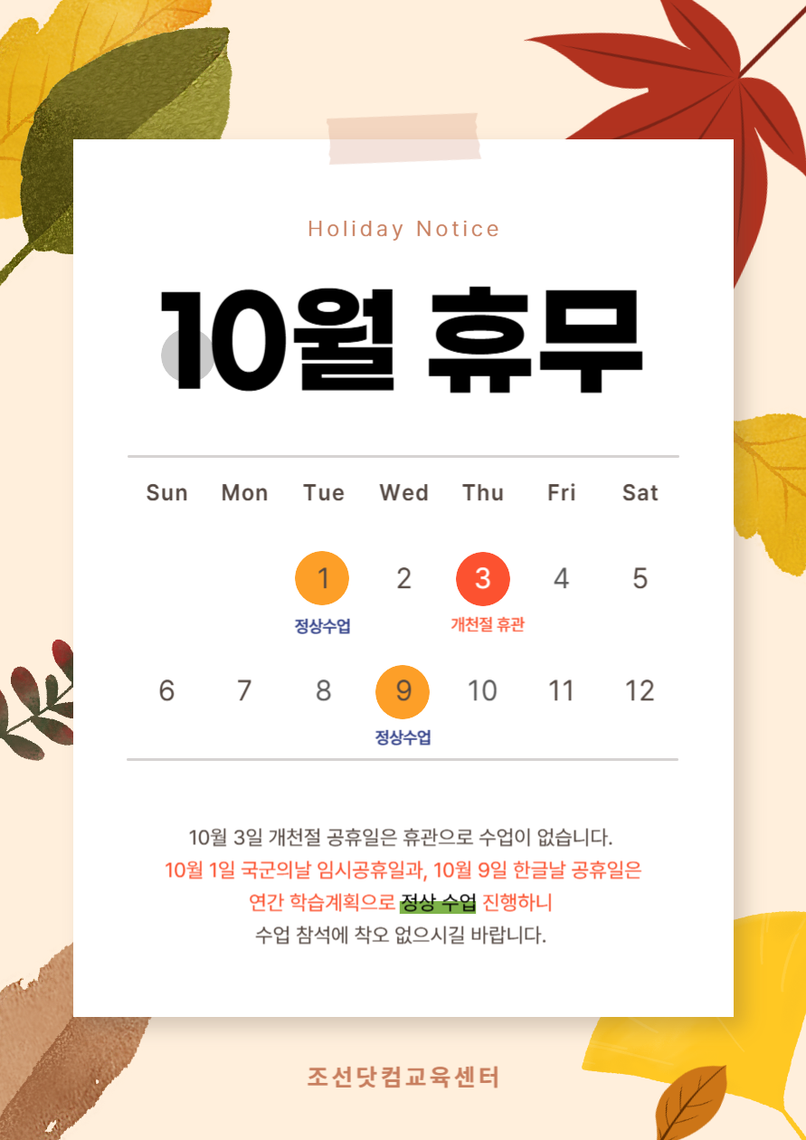 [¼ºÀÎ]10¿ù °øÈÞÀÏ ÈÞ°ü ¹× Á¤»ó¼ö¾÷ ¾È³»